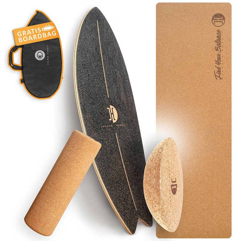 Rullo in sughero, semisfera Plank Ball in sughero, tappetino in sughero e borsa per balance board.